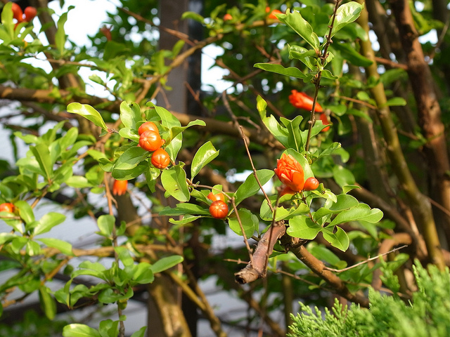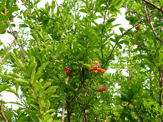 隣家のザクロが花を付けていました。この花がやがて、野球のボール大の実になります。