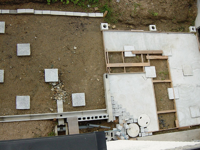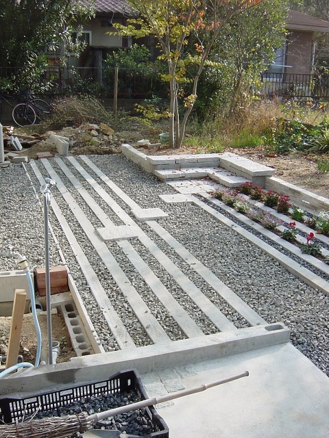 コンクリートが固まったら木枠を取り除き、隙間にバラスを詰めれば、目的とするコンクリートとバラスのテラス(?)が出来上がりです。バラスのおかげで排水は抜群な上に、鉄筋のおかげで4年近くを経過したいまでも、格子にひび割れは入っていません。
