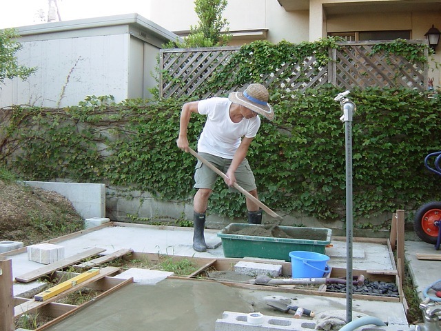 その後、地面を掘る作業に何日、いや何ヶ月を要したか忘れましたが、体感的には全行程一年間のうち、半分は穴を掘っていたのではないかと思うほどです。はじめのころは、手は豆だらけになり筋肉痛も残り、作業は確かに大変でした。それでも、作業の跡が成果として見えはじめると、なんともいえない充実感、快感におそわれますね。掘った地面を見やりつつ汗を拭き、しみじみと農耕民族の血を引いているなあと思ったり(笑)。そして、風呂上がりの抜群に美味しいビール。