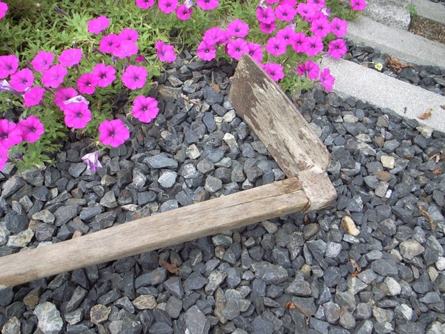 庭作りを思いつく前から除草のために鍬を持っていました。はじめはその鍬で庭を掘り下げはじめたのですが、除草用の引き鍬のため、硬い地面を掘るのは大変でした。その様子を見ていた次男が、初任給のお祝いに金象印の鍬を新調してくれました。ちょっと小ぶりですが金属部分が厚く頑丈な打ち鍬です。赤地に金の象をあしらったラベルがまぶしい(^^)。