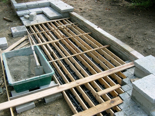 写真の木枠の幅は10センチ間隔で、木枠の縦横に鉄筋が通してあります。つまり、外観は格子ですが、構造的には網状です。この網が地面を掘り下げた粘土層に被さるわけです。その状態で枠にコンクリート(正確には砂とセメントのモルタルです)を流し込めば、暗渠を覆うコンクリートの格子網ができあがるとうわけです。