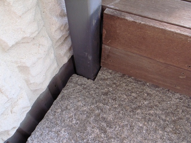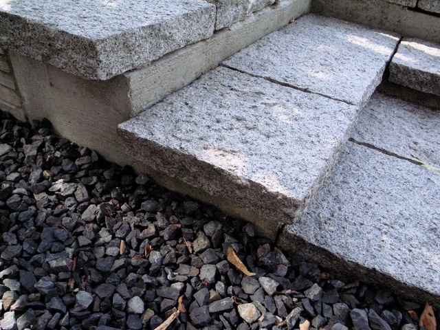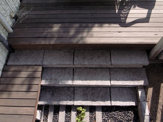 写真は現在の階段ですが、一段目の右端と三段目の左端が基本寸法と異なります。とくに、後者の石の端には雨樋があります。結果からいえば、写真のように石を切ればいいのですが、当時は自分で石を切るという発想がなく、クルマに石を積んで石材屋さんに行く予定でした。