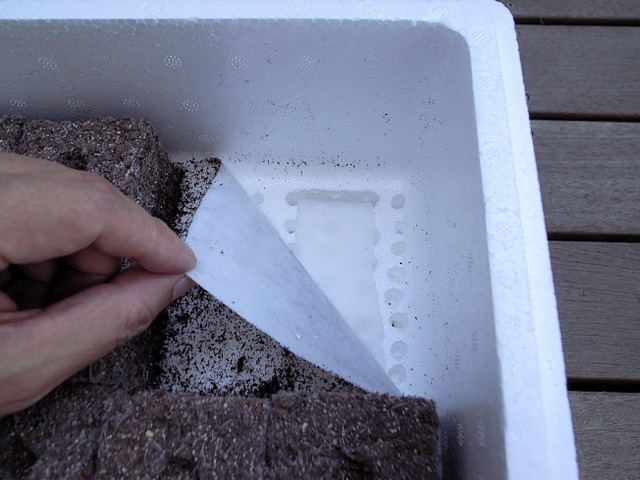 成形土壌には指先ほどの凹みがあり、通常はここに種子を蒔いて発芽させますが、いまは真夏なので、発芽温度が30度前後の品種でないと発芽はむずかしそうです。この季節、実際にこの「底面潅水式トロ箱栽培キット」を試すには、苗を買ってくるしかなさそうです。