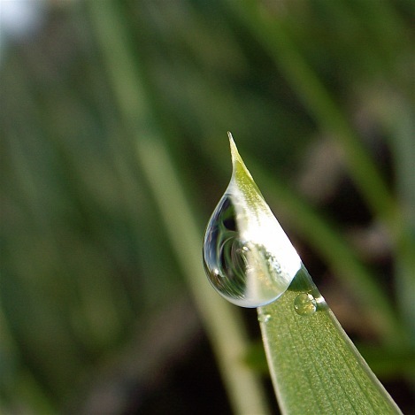 水カンナの水滴へのコメント、すごく嬉しいです。目に見えるちょっと向こうを覗くのは、ほんとうに面白い体験ですから。最近のカメラって、小さくて力一杯で、まるで玉手箱ですね。写真は、以前に撮った、たぶんショウブの葉に結実した水玉です。