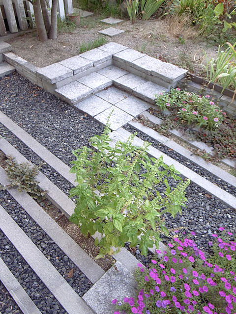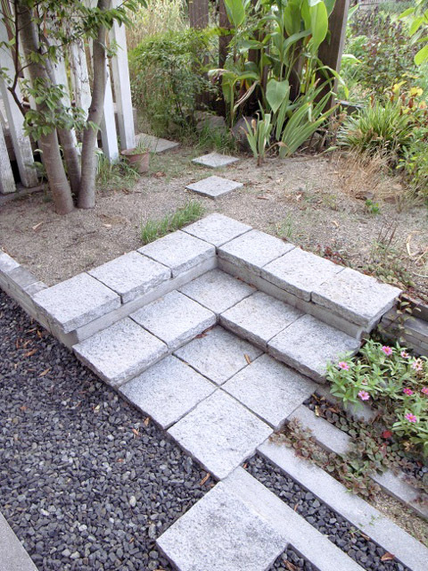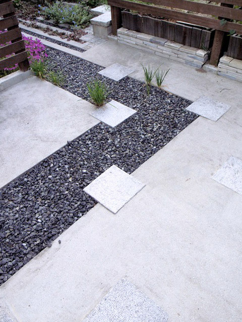 それと同時に、飛び石のなかにも、正方形のものを斜めに配置したものも多く見られます。「これって、そのまま使えるじゃない」というのが正直な印象でした。こうなると話しは簡単で、コンクリートとバラスの格子、正方形を単位とする飛び石、45度の配列、これを組み合わせて全体をレイアウトすれば、これもまた何とかなりそうです。だいたいいつも、「なんとかなる」のです(笑)。