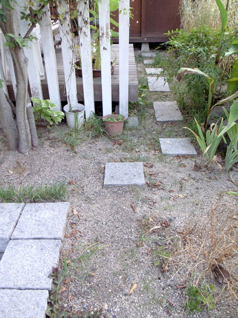 これで、リビングからデッキに出る室内からの動線と、テラスからデッキを通らずに物置に行ける庭中心の動線と、ふたつの小径ができたのではないかと思います。実際のところ、家庭菜園や草取りの作業をする場合、デッキを迂回できる動線があった方が好都合です。