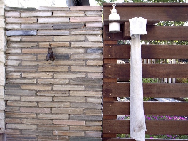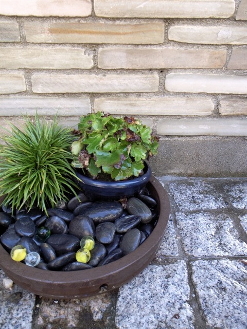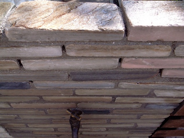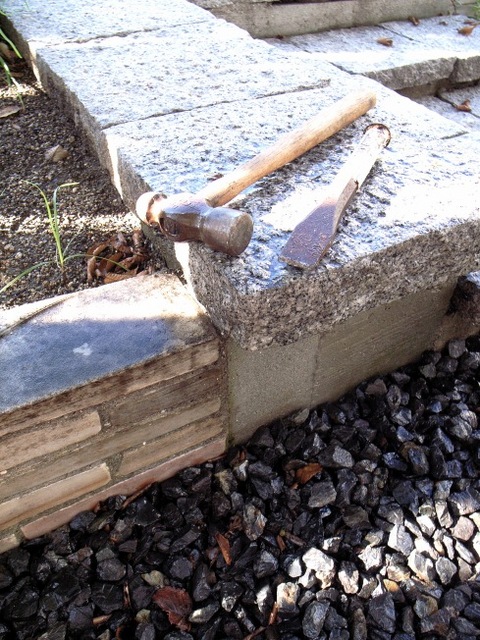 話しが前後しますが、すべての石をディスクで切ったわけではありません。みかげに手こずる前に、蛇口を設けるための立ち壁部分と、菜園とテラスの見切りに石を使いました。厚さ3cmのストーンブリックを平積みしただけのものです。おそらく、トルコ産のライムストーンではなかったかと思います。