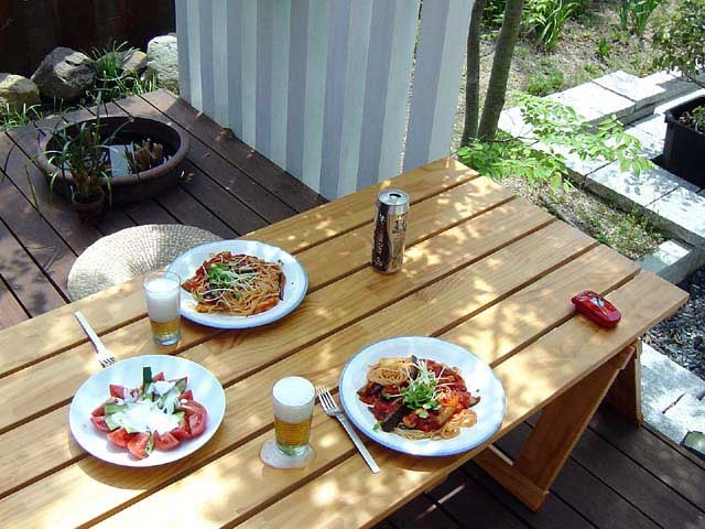 写真左はデッキで座卓を使っていたことのひとこまです。このころは、料理はキッチンで調理したものをお皿に装って運んでいました。携帯のデザインが懐かしい(^^)。