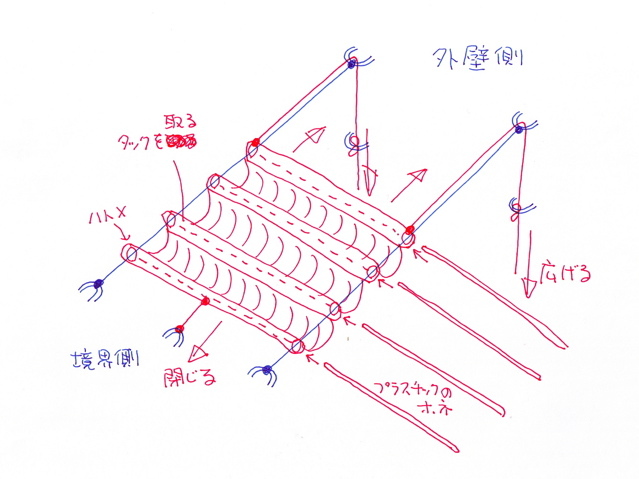 そうした試行錯誤のなかでイメージしたのは、海辺のホテルで見かけるような、可動式の日除けです。ロープの端を巻き上げることで布がスルスルと延びてくる開閉式のもの。これを建物の外壁から敷地境界に張ることができれば理想的です。問題は、そういう日除けが手に入りそうにないことでした。しかしこれも、仕掛けは簡単だから作ればいいやと、手作りすることを決めました。写真の絵はその原理です。
