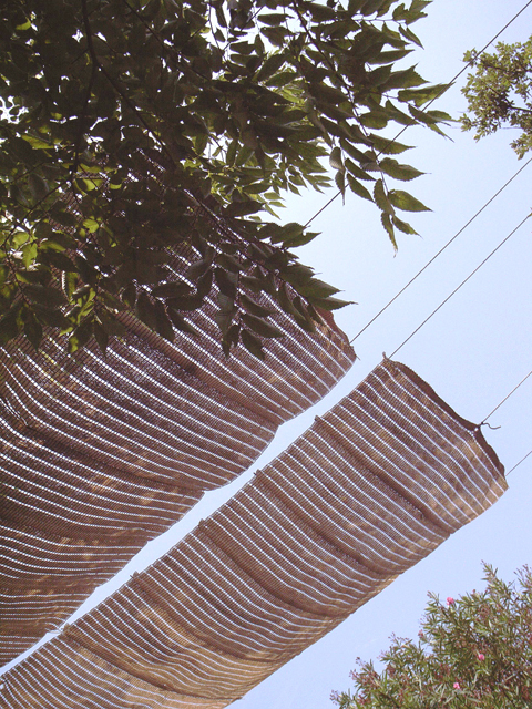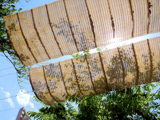 日除け布はホームセンターで手に入る、ごく普通の西日除けのシェードです。これを適当な間隔でタックを取り、簡単に縫い合わせて両端に直径20mm程度のハトメを取付けロープを通します。タックの部分を縫う際に園芸用のプラスチックの骨(キャベツなんかの覆いをするとき使うもの)を入れると布に張りができてカッコよく仕上がります。これで、「海辺のホテルで見かけるような可動式の、マイ日除け」が完成です(^^)/。