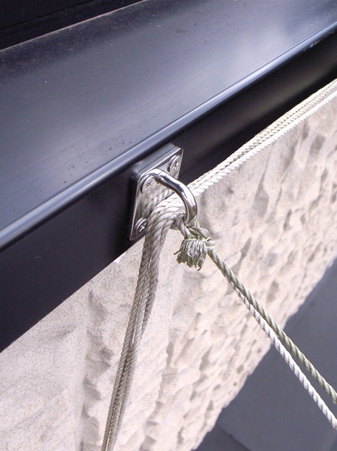 図中の青が固定ロープ、赤が可動のロープと日除けです。Aを下に引くと日除けが壁側に広がり、Bを引くと閉じます。閉じるにはロープを引くだけでなく、日除け自体を手で動かす必要がありますが、お手製と思えば苦になりません。シンプル・イズ・ザ・ベストという言い訳もあります(笑)。外壁への固定は市販の端部金具を使いました。Aのロープも下側付近にも同様の金具を取付け軽く結束します。我が家ではこの日除けを二連で使ったのでAのロープが4本あります。これがばらばらだと煩雑なので、4本を左の端部金具にまとめています。