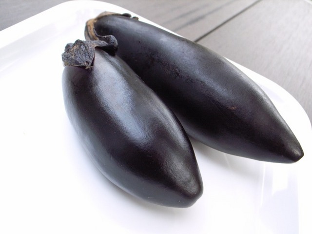 「庭トロ1号」でできたはじめてのナスを摘み取りました。あ、手前のが庭トロ製です(^^)。道の駅で買った農家のモノと比べると見劣りしますが、心なしか艶がいい感じ。自分が手塩にかけたものは、どうもひいき目に見てしまうようです。さっそくクッキンガーデンのテーブルに置いて写真を撮りました。これもひいき目。実際の見え方よりもかなりチビナスが背伸びしてます(^^)/。