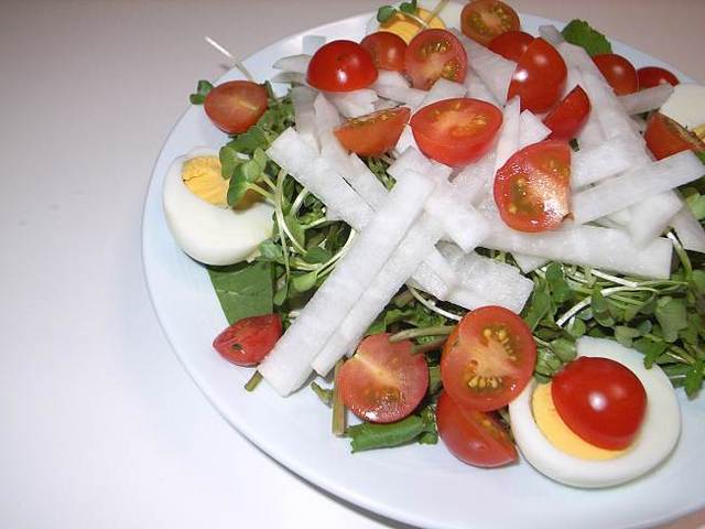 こうして、この夏最後の庭野菜をダイコンと卵と合わせてサラダに。ただたんに、食材を切ってお皿に盛りつけただけですが。フレンチドレッシングでもマヨネーズ系でも、なんとかサラダになります。