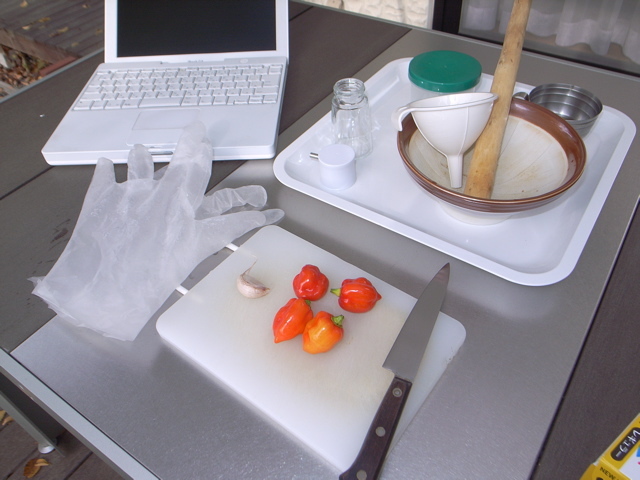 ハバネロを使ったタバスコづくりについては、ネット上でも「絶対素手で触らない、ゴーグルを用意する」などと注意書きが目につきますが、これは守るべきでしょうね。私も手袋を着用しました。それと、こういう料理こそ、庭のテーブルが重宝します。換気扇をまわす必要もないし、少々飛び散っても大丈夫。これぞ、クッキンガーデンにうってつけの料理です(^^)/。