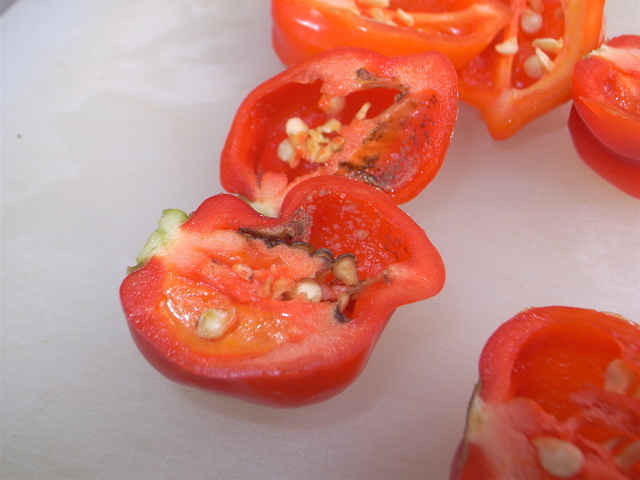 実を開くと、ひとつにちょっと虫食いがありました(右上)。虫は辛さは感じないのかなあ???