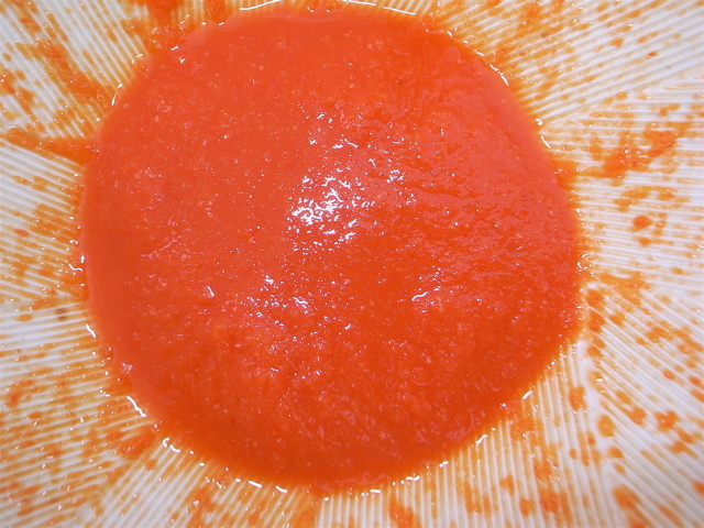 材料を混ぜたら、あとはひたすら擂り鉢で摺り降ろすだけ。これはかなり根気がいります。最後に残った数片の種の皮がなかなか潰れませんでした。結局、市販のトマトペースト状になるまで、30分くらいかかりました。