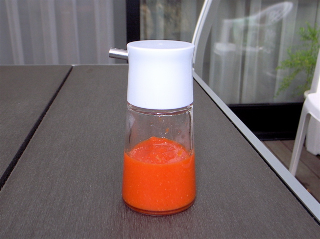 少しだけ自己流にしたのは、ニンニクを入れたことと、容器の口が小さいので少し粘度を低くするために酢の量を10%ほど多めにしたことです。でも、これでも粘度だけからいうと、市販のタバスコの方がサラリとしています。
