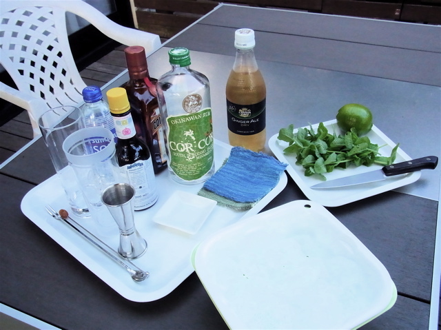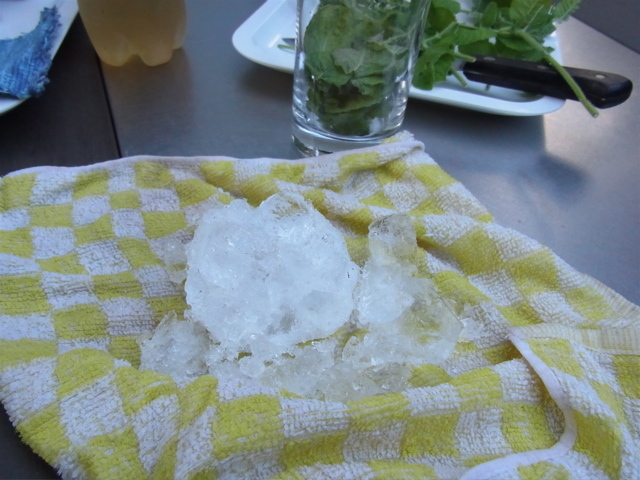 あ、そうそう。氷はクラッシュアイスが定番で、はやりいちばん美味しくできると思います。普通、クラッシュアイスを常備している方は少ないと思います。その場合、濡らした布巾に氷を包み、庭の石とかコンクリートに打ち付けて砕くと簡単で手軽です(写真)。
