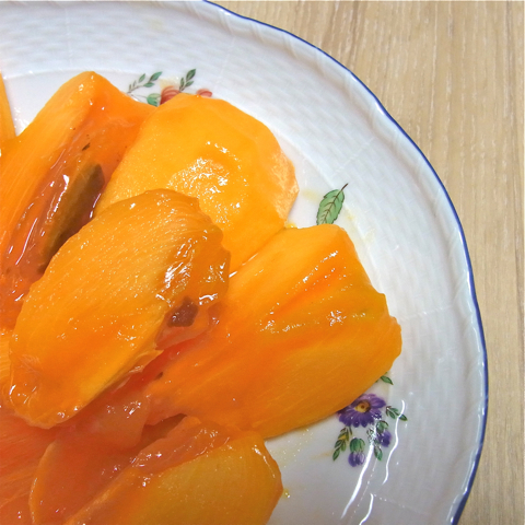 このまま熟柿になりはしないかと案じた妻が、焼酎で渋抜きをしたのが4日前。かなり柔らかくなっているというので、一週間を待たずに食べてみました。