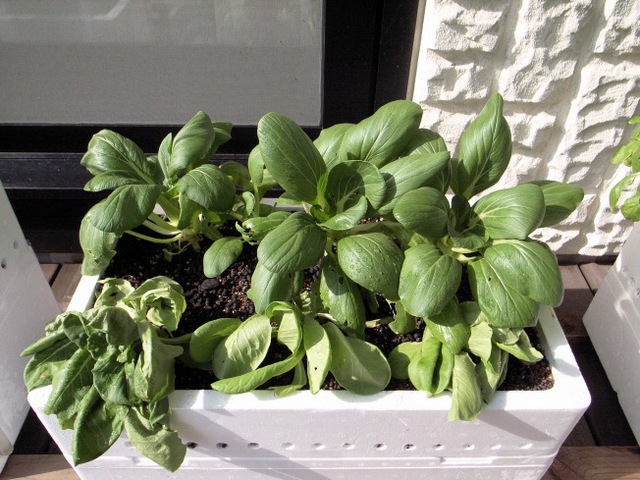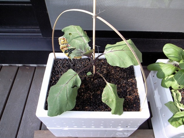 もともと苗が育っていたせいで、チンゲンサイの成長が著しいですね。その葉影でサラダ菜が迷惑顔です。この大きさのトロ箱に6株がそもそも過密なんですが、これをどうコントロールするかですねぇ・・・。様子を見ながら、チンゲンサイの下葉を早めに収穫することにしましょう。ナスはどうなんでしょう。あと25日ほどで本当に実が採れるかどうか、もう少し待つとしましょう。