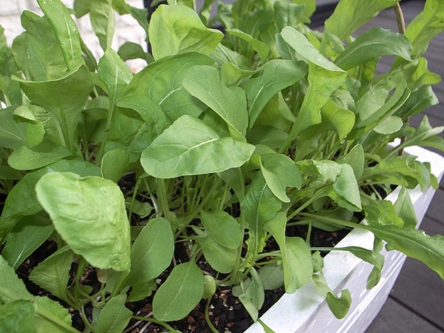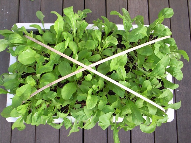 不織布のネットを掛けて二週目のルッコラです。観察していると、いつもネットの上を蟻が歩いていますが、中には入れないようです。とりあえず、防虫網の効果は発揮しているようです。二週目にしてやっとネットを取ってみました。先週は雨だったり、激務だったりして。ジャ〜ン。いや、なかなか見事です。さがに虫食いもありませんね。一枚つまんで口に入れると、胡麻の味と心地よい苦味が口に広がります。葉丈も15センチくらいはあります。今夜のサラダはルッコラに決定!