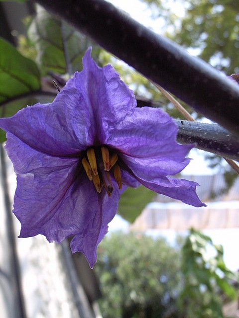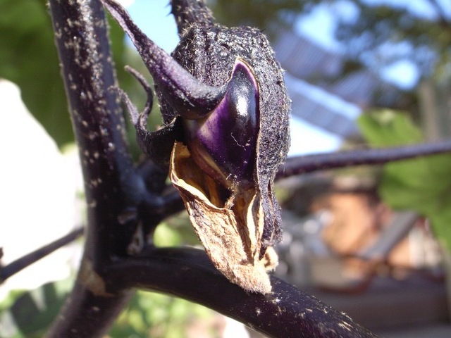 「30日で収穫できる」はずのナスが、ついに第6週に入りました。まあ、よほど特別な品種でない限り、積算温度が足りなければ30日は無理なんでしょうね。要するに、売れ残りの普通の品種を植えた結果です(^^;)。でも、6週目にして朗報が。ナメクジの犠牲となった一番花の試練を超え、やっとツヤツヤの実が姿を表しました。といっても、まだガクの隙間からチラリと見えるような幼子です(^^)。三番花もいい姿で咲いています。現在のところ蕾は六つ。さあ、寒さが勝つか、ナスが勝か!?