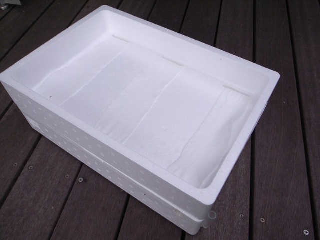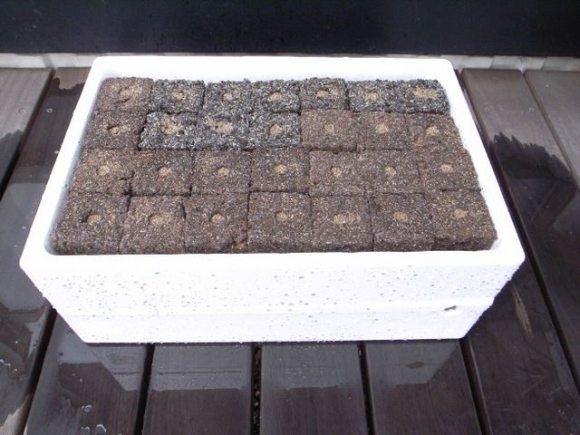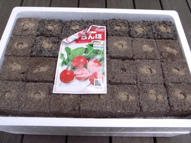 写真下は、エクセルソイルを並べて真ん中の穴に二十日ダイコンの種を4〜5粒落とし、砂で覆土したところです。この状態で静かにジョウロで潅水し、庭トロのスチロールの蓋で遮光すれば準備完了です。