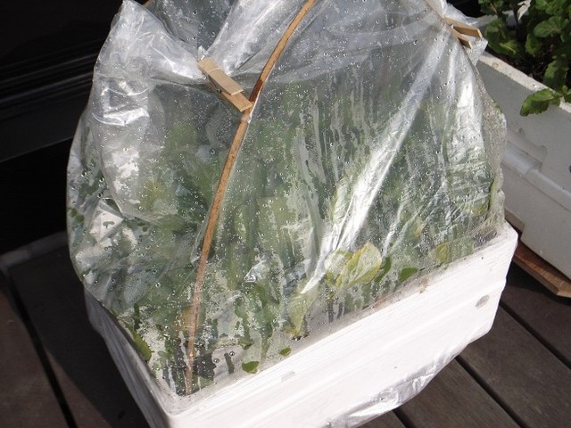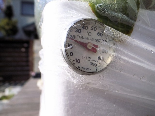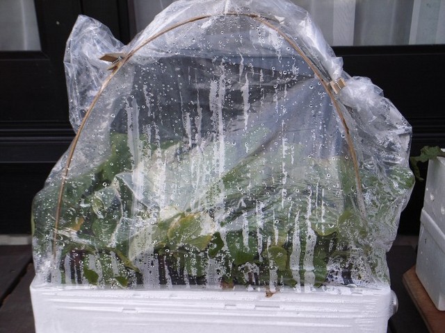 陽が射しはじめると温度計の針がグングン上がって、曇りがちな今日でも夕方まで平均15℃ほどをキープしています。袋の内側にに水滴がついて日光が遮られるのがちょっと気になりますが、まあ、生育に必要な光量はありそうです。