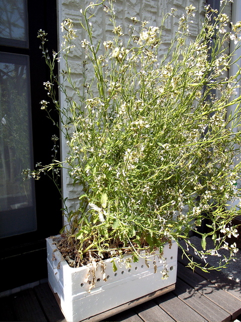 4月も後半に入りましたが、「庭トロ1号」のルッコラ、まだまだ健在です。っていうか、まともに人生をまっとうしているという状態。縮れた花を携えつつ、草丈1mの立ち姿で優雅に風に揺れています。