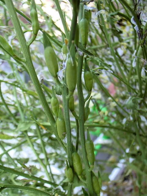 そのルッコラに、いっぱい種サヤができています。大きなものだと2cm位あります。このまま枯れるのを待てば種が採れるはずです。
