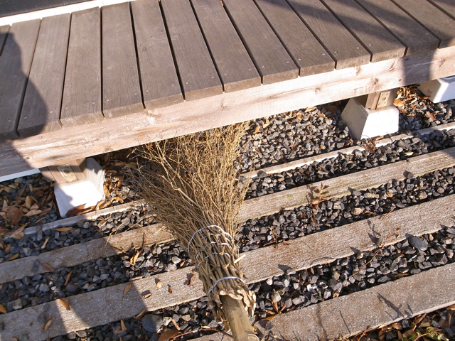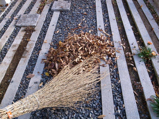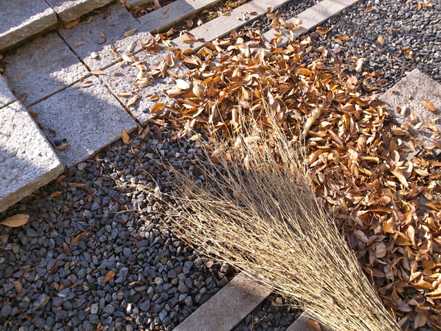 実はこの落ち葉と小石の組み合わせ、神社やお寺の定番です。なので、掃除の方法も同じ。新しい笹箒を用意し、薙刀を構えるように低く持ち、地面スレスレを泳がすように掃くと、簡単に落ち葉をかき集めることができます。