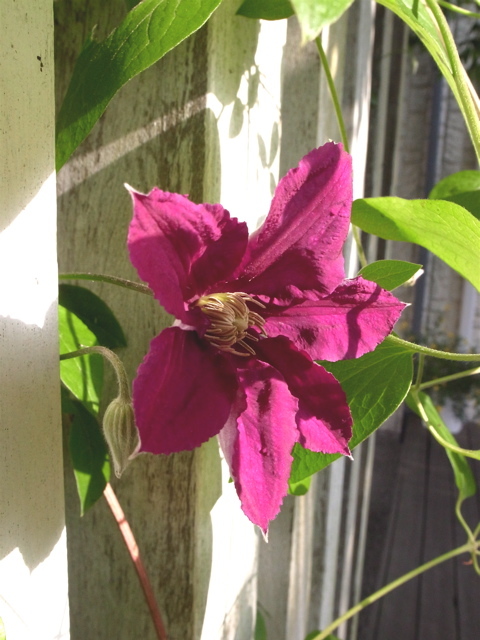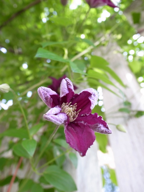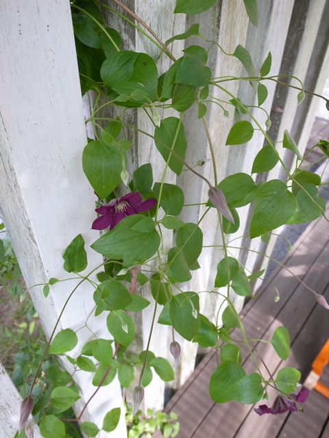 開花が遅れていた我が家のテッセンが、やっと花を咲かせました。それも一斉にです^^。ちょっと古びたラティスにコントラストを添える深紫の花。蕾はいったいいくつあるのだろう。でも、こうして咲く花の影で、虫の食料にはる花もあります。小さな庭の生き物たちも、自然の摂理という大きな法則に包まれているんだなあと思います。