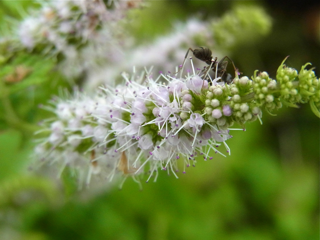散歩道のTさんの庭先で、こぼれるようにミントの花が咲いていました。紫色の小さな雄しべが可愛くきれいです。それにしても、こうして花の写真を撮ると、かなりの確率で虫たちが群がっている様子がわかります。もし、植物と昆虫のフィルターがあって、植物だけを隠したり、昆虫だけを隠したりして撮影できたら、どんなことになっているのでしょうね。星空のように虫たちが空間にちりばめられているのかな。