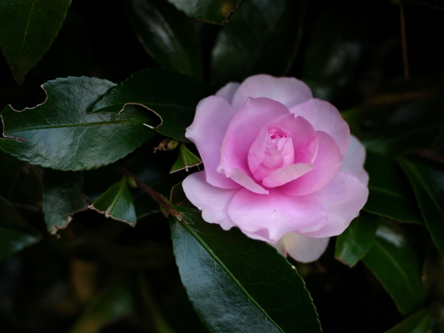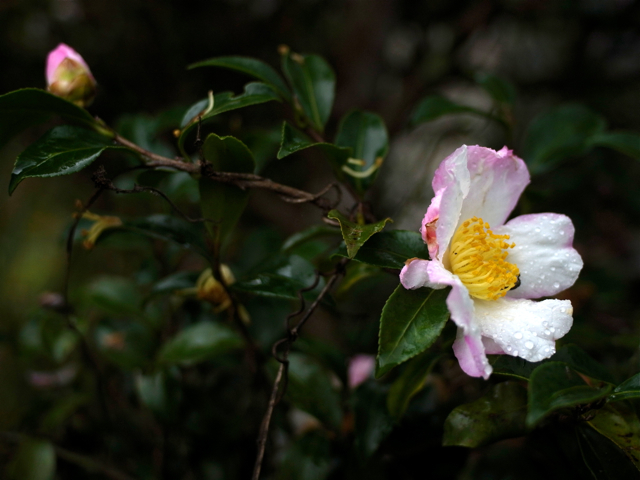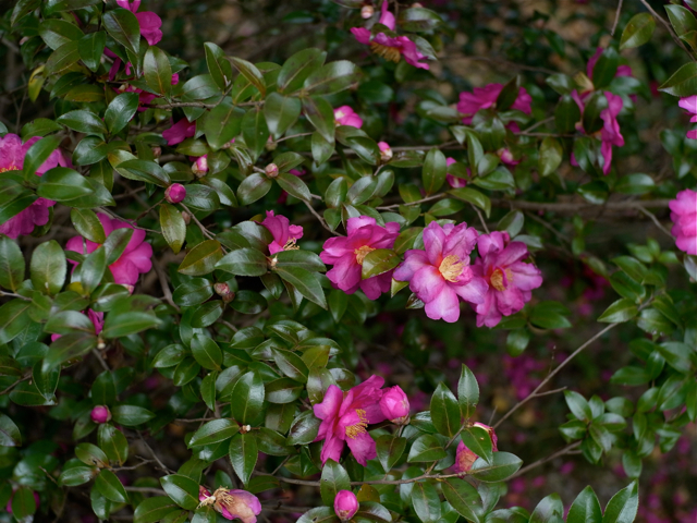 今年は、散歩道のあちこでサザンカを目にしました。風景が茶色く色づく季節のなかで、深い緑の葉につつまれて咲く紅い花がとても印象的です。椿に比べると花持ちがいいように思います。