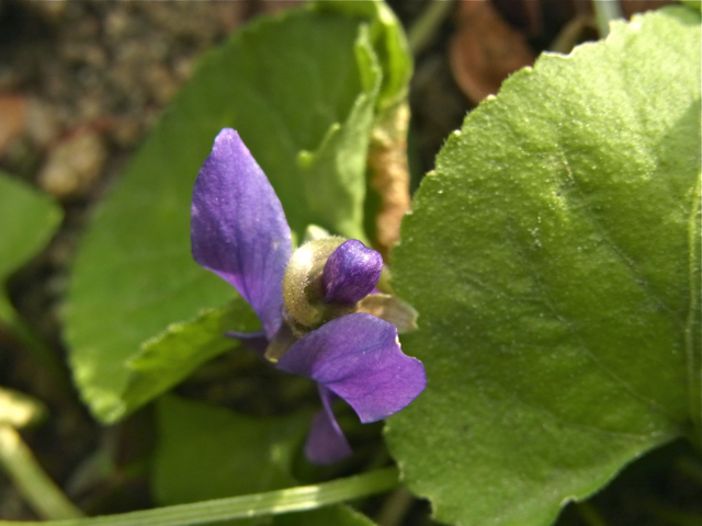 ほとんどが枯れ草の、真冬の庭に一点の紫を見つけました。スミレです。春のスミレのように茎がなく、縮こまって小さな花をポツンと付けている姿が、いかにも冬を感じさせます。
