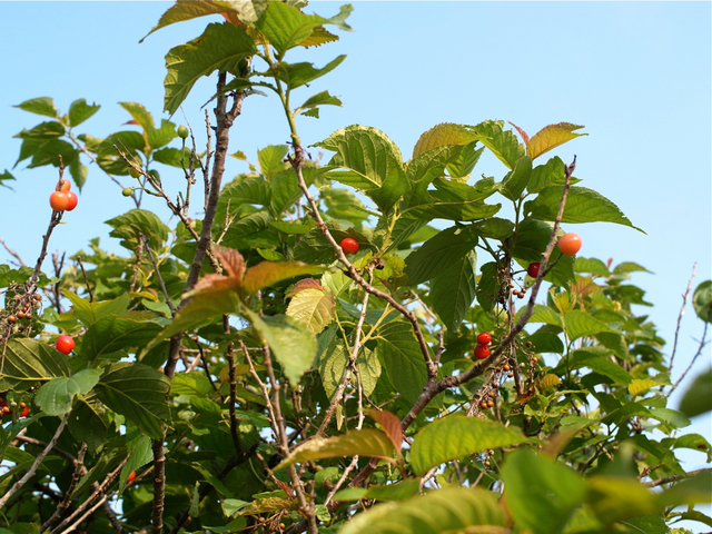 散歩道の脇道に、ちょっと控えめにサクランボが咲いていました。