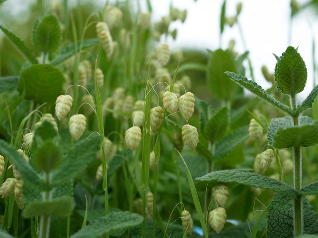 散歩道でコバンソウを見つけました。気付かなかったけど、手前にミントが写っています。交雑種なのかな。こんど摘んでみよう。