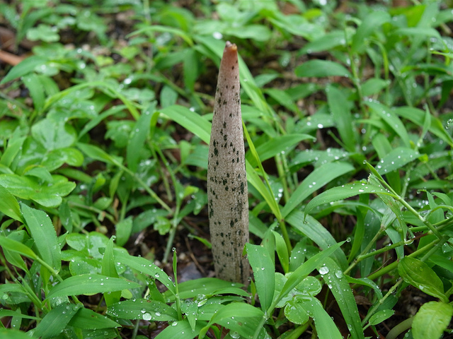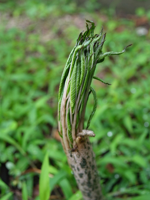 (撮影:6月16日)ふと気がつくと、お向かいさんの菜園が、雨後のコンニャク状態でした。よく見ると、雑草の間からびっくりするほどの数のこんにゃくが芽を出しています。うっかりとは歩けない^^すごく印象的な、まるで犬のシッポがニョキニョキしているような姿ですが、実際にコンニャク芋が取れる株はそんなに多くないそうです。