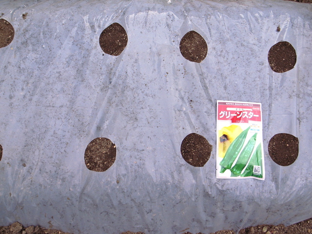 そこで思いついたのが、ダイコンに被せてあったマルチ。ダイコンの方はもう双葉が出たので、こちらのマルチをそのままオクラの畝にお引っ越しという作戦。これで多少は地面の温度が上がるはず。思惑通りになるかどうか。