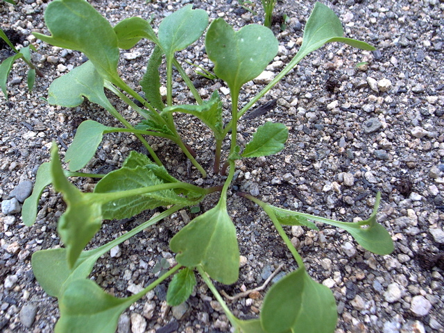 写真上が間引く前です。右の写真をよく見ると、一本の茎に葉が三枚付いています。このくらいのときに、一カ所1〜2本に間引きます。ダイコンの場合は最終的に1本にする方がいいようですが、ミニダイコンなので2本づつ育ててみることにしました。