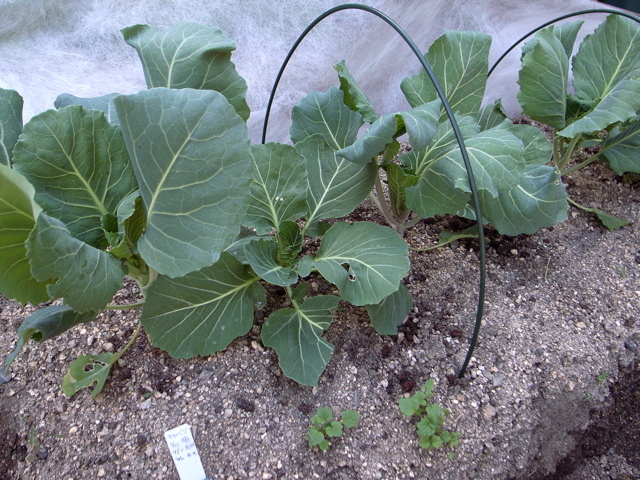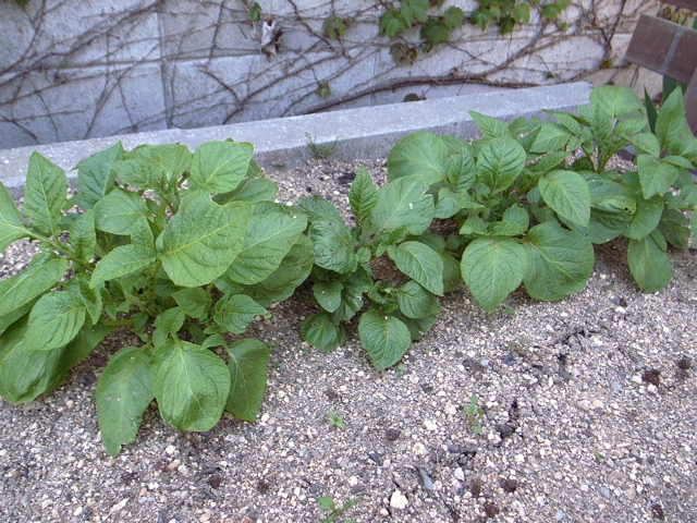 ジャガイモ(左)もキャベツ(右)も順調に育っています。キャベツは、被害を受けたのと無害のとで、いよいよ生育に差がなくなってきました。そうなると気になるのが密植です。いまは様子を見守るしかありません。ジャガイモは、来週には芽かきの予定です。