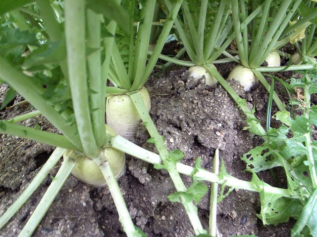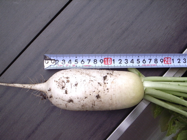 「かわいいダイコン」の種蒔きをしたのは4月5日、収穫まであと一週間から10日くらいでしょうか。でも、ムクムクと地面から顔(肩かしらん?)を出した姿にそそられて、試しに一本を先取りしました。エイヤ! と力んだものの、スポンと抜けて拍子抜け。なんたって「かわいい」ダイコンですからね(笑)。計ってみると長さ15cm弱といったところ。さっそっく食べてみると、スもなく若々しい味です。来週が楽しみです。問題は、つぎの収穫までに何本残っているか。ガマン、ガマン(^^;)。