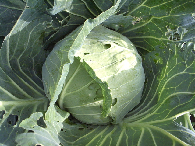 出張から帰り、懐中電灯で久々の菜園を除いて愕然。「・・・キャ、キャベツがない!」 いちばん成長していた南端の一個がすっぽり消えています。