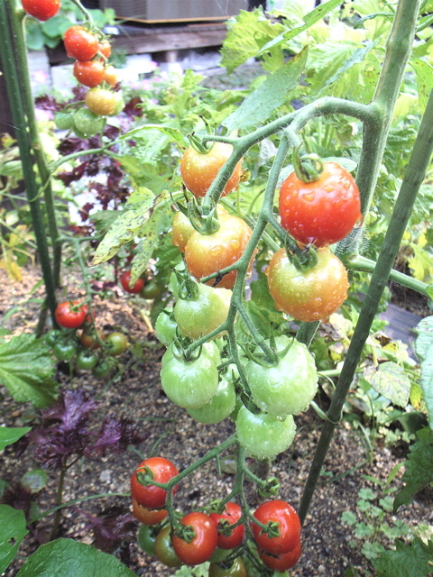 写真はそのひとつですが、プランターのミニトマトと比較するために、こちらにはいっさい肥料をやらず、ほとんどノーメンテナンス。でも、こっちの方が実は大きいみたい(^^;)。まあ、品種が違うのでなんともいえませんが、過酷な環境を生き延びた種の強みでしょうか。しっかりとした実が成ってきました。