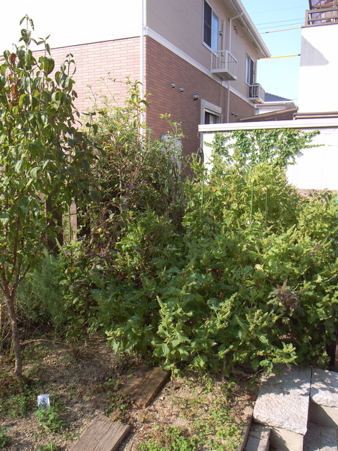 いつまでも収穫が続くミニトマトを楽しむうちに、9月も終わりに近づいてきました。すでに秋まきの野菜の準備にも遅いくらい。連休の最後の今日、ミニトマトに別れを告げ、畑の準備をすることにしました。写真は取り掛かる前の一坪菜園の様子です。左が東側からの様子。右がジャングルの中です。あるのは、シソの群生とミニトマトのみ(笑)と思いきや、わずかながらオクラやムカゴが生きていました。