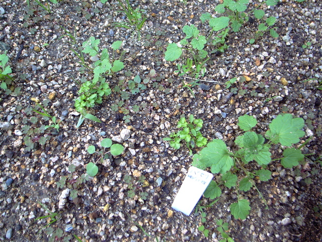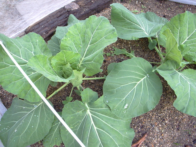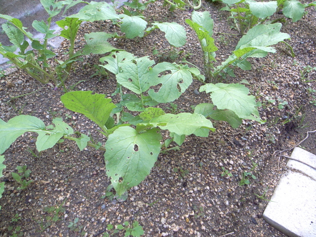 カリフラワー(左上)、キャベツ(左下)ともに、新築(?)した覆いのなかでスクスクと育っています。覆いのないダイコン(右上)と比べると、ナメクジの被害も少ないようです。写真右下はパセリの発芽の様子です。やっとパセリとわかるまでになりました。どれがパセリかわかりますか? それにしても、こぼれた種から自生したミニトマトの生命力はすごい。でも、そろそろ抜き取る時期です。ミニトマトには申し訳ないけど。
