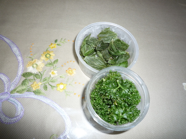 大量に出来ても大丈夫!!昨年夏に庭で収穫し、取れすぎたパセリくんたちは、水洗いし、充分水気が取れたら小分けにして冷凍保存。この方法だと、まな板&包丁を使わず、指先でパラパラと「みじん切り」になります。しょうがを丸のまま冷凍し、そのままおろし器で使う分だけすりおろす。その方法だと太い繊維が残らず、滑らかになります。そんなこんなの応用です。スーパーで買ってきたパセリも同じ方法で保存できます。写真の上はバジル、下はパセリ。どちらも2009年ものです(笑)。