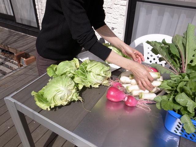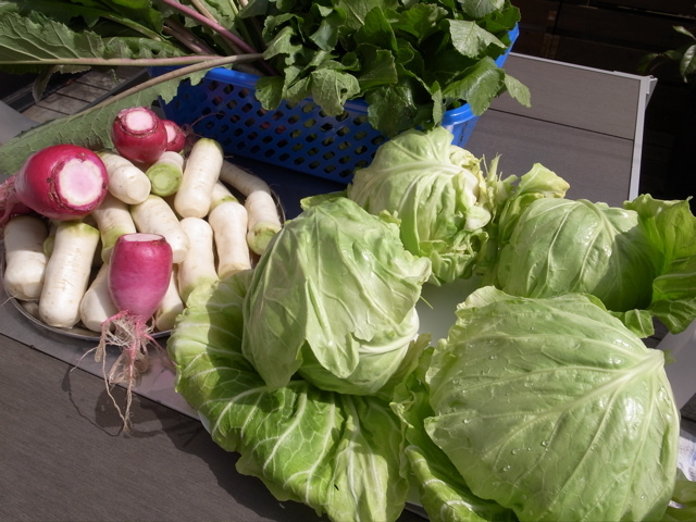 収穫したキャベツ、ミニダイコン、赤カブをクッキンガーデンのテーブルに整列させてみました。相当な量です。半分はご近所にお裾分けをし、今夜はダイコンを具材にしたダイコンカレーを作ります。