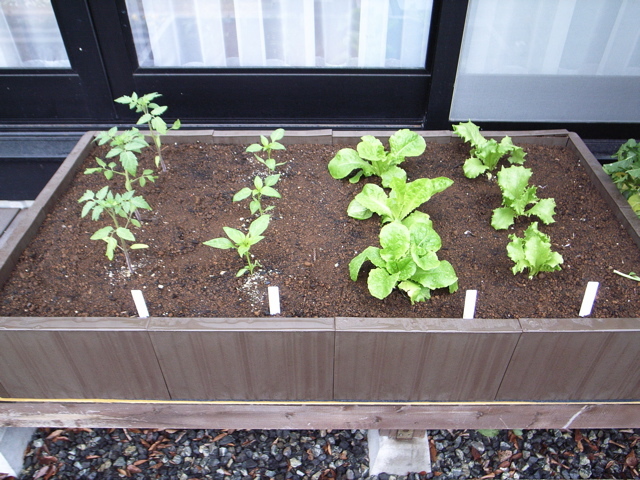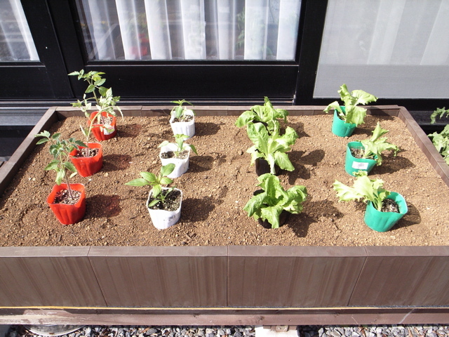 3月21日、一坪菜園の作業と同時に、DIY-PLANTERにも苗を植えました。植えたのは以下の野菜です。・ミニトマト・ピーマン・チマサンチュ・レタスとくに元肥は施していなかったので、苗の間に遅効性の肥料を施しました。たっぷり水をやって、しばらく様子見です。うまく育ってほしいなあ。
