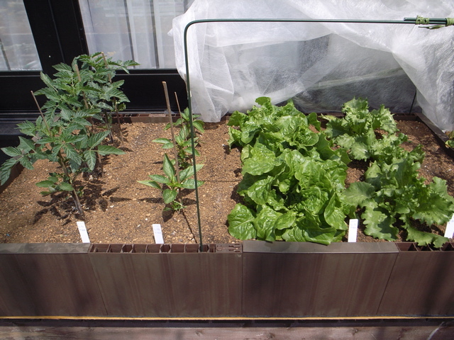 DIY-PLANTERに植え付けた野菜たち(ミニトマト、ピーマン、チマサンチュ、レタス)、すべて順調に育っています。いまのところ、虫食いもありません。先週、行った追肥がうまく効いているようです。追肥したとき4-4-2の肥料ではちょっと弱いかと思いましたが、少なめで正解でした。足すことはできても、途中で減らすことはできませんからね。チマサンチュはもう食べごろなので、さっそく今夜のメニューに加えることにします。楽しみ、楽しみ(^_^)。